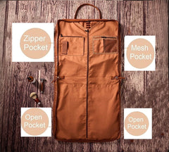 User - friendly details take this garment bag to the next level. An elastic band with a clip is included to clamp the hem of your clothes, preventing them from rolling up or crowding together inside the bag—this small but essential feature ensures every item stays in its intended place. At the top of the bag, a sturdy metal hanger makes it easy to hang the bag in hotel closets, locker rooms, or at home, while three braided rings add extra convenience, allowing you to attach small accessories like keychains or luggage tags. Available in two classic, timeless colors—Brown and Coffee—this bag complements any style, whether you’re dressing for a business meeting or a special occasion.