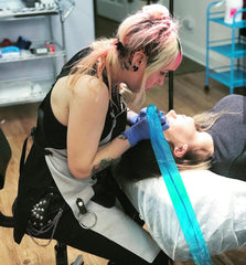 • Woman wearing black and gray two - tone apron with leather straps and pockets, white background
